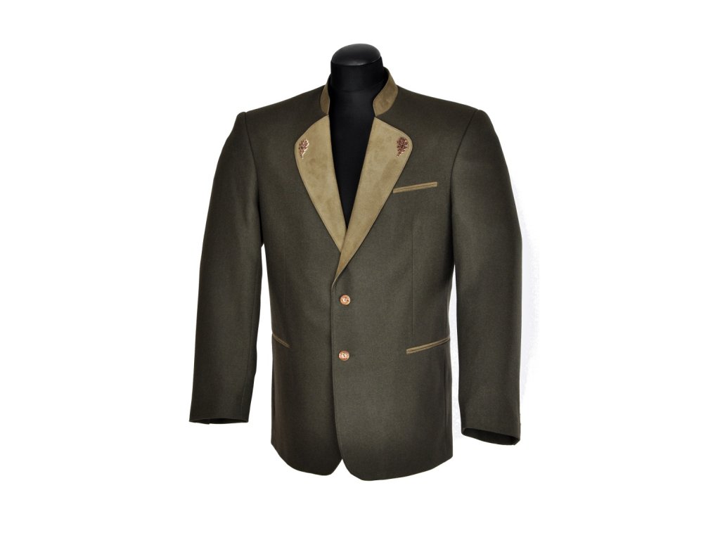 Komplet se skládá ze saka a kalhot. Materiálem je kvalitní loden (složení: 80% vlny / 20% polyamid). Elagantní vzhled dokresluje světlé lemováné imitující kůži. Prodyšnost při nošení zajišťuje lehká polyesterová podšívka.