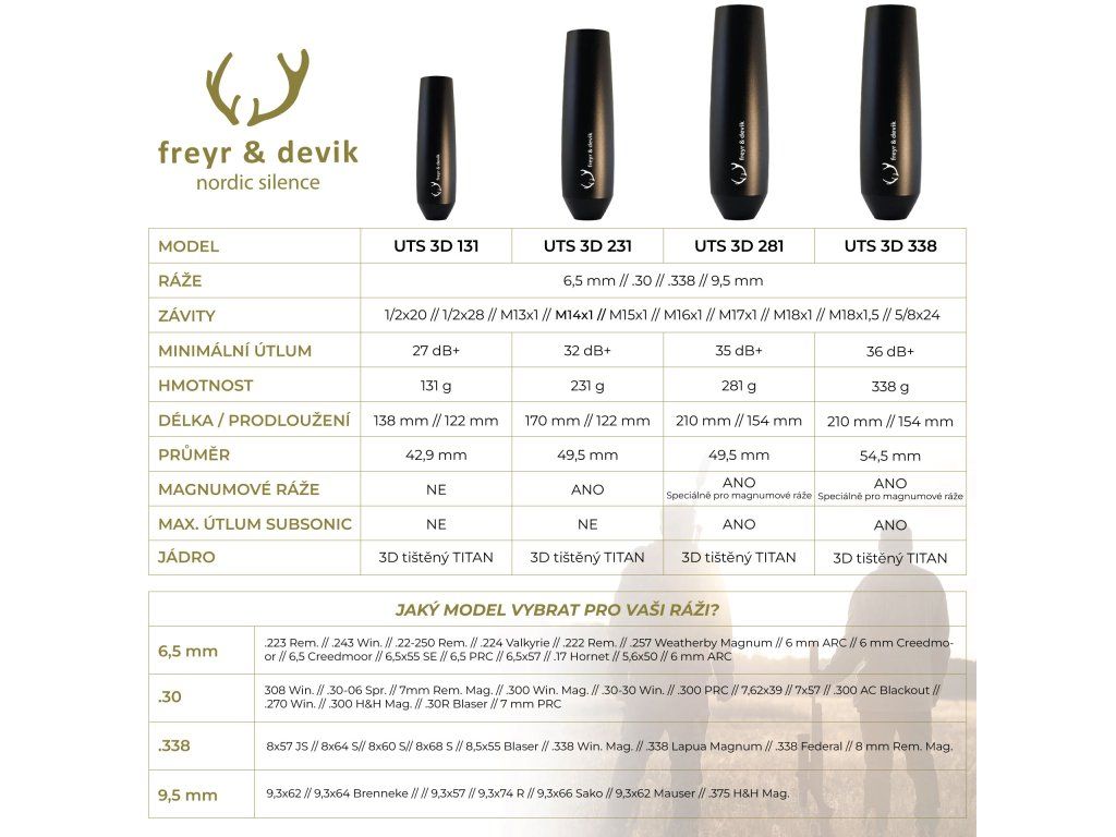 Tlumiče hluku norského výrobce Freyr & Devik jsou konstruovány s důrazem na precizní zpracování a použití nejmodernějších dostupných materiálů jako je titan a letecký hliník. Díky svému netypickému vzhledu jsou zaměřeny především pro použití na dlouhých loveckých zbraních, ale své využití naleznou určitě i na zbraních pro sportovní dálkovou střelbu. Z důvodu materiálů použitých k výrobě se jejich majitelé mohou spolehnout na nízkou váhu, útlum až 41 dB a uživatelskou přívětivost - to především proto, že k jejich rozebrání a čištění nepotřebujete žádné nástroje.
