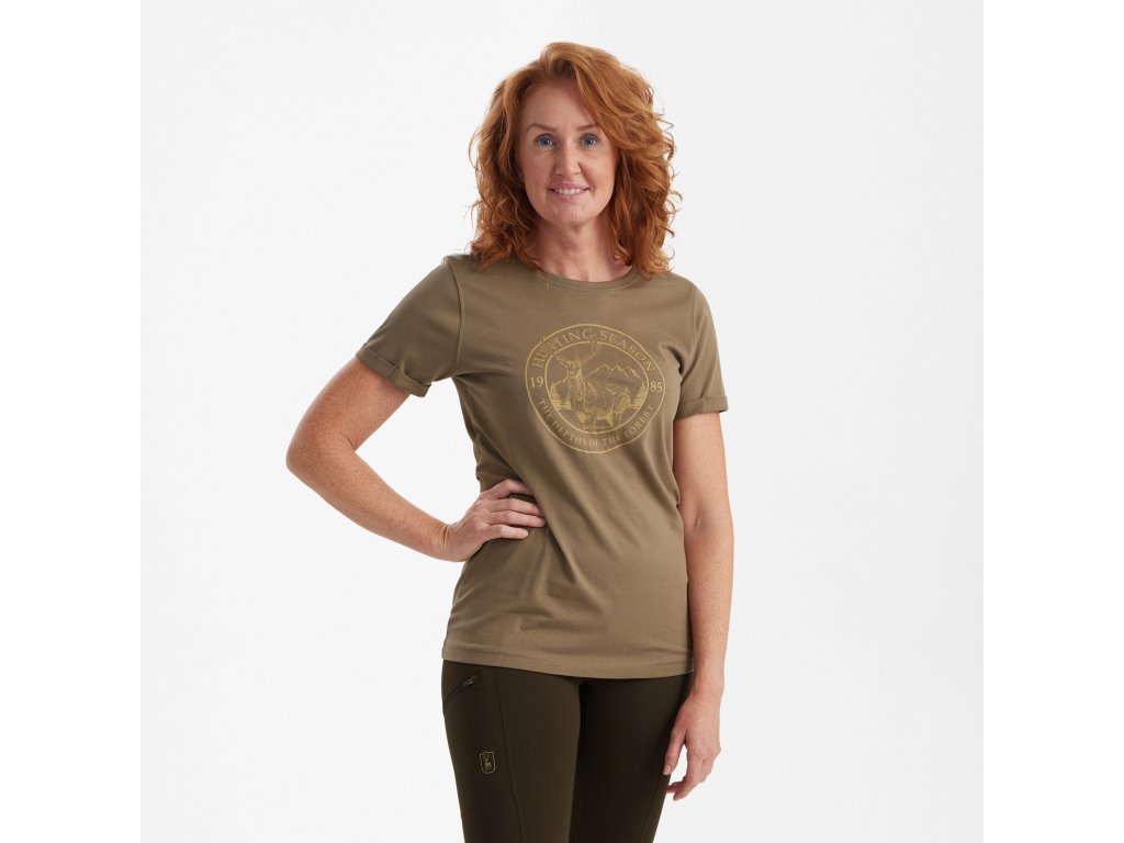 Dámské tričko Deerhunter Lady Ella (Driftwood), s kruhovým výstřihem a pohodlným ženským střihem. Vyrobeno ze 100% měkké bavlny (160 g/m2), s výrazným loveckým potiskem jelenů a nápisem „Hunting Season 1985“ na přední straně a decentním vyšitým logem Deerhunter na rukávu. Ideální volnočasové a outdoorové tričko. Oeko-Tex® certifikace zaručuje bezpečnost pro pokožku i životní prostředí.