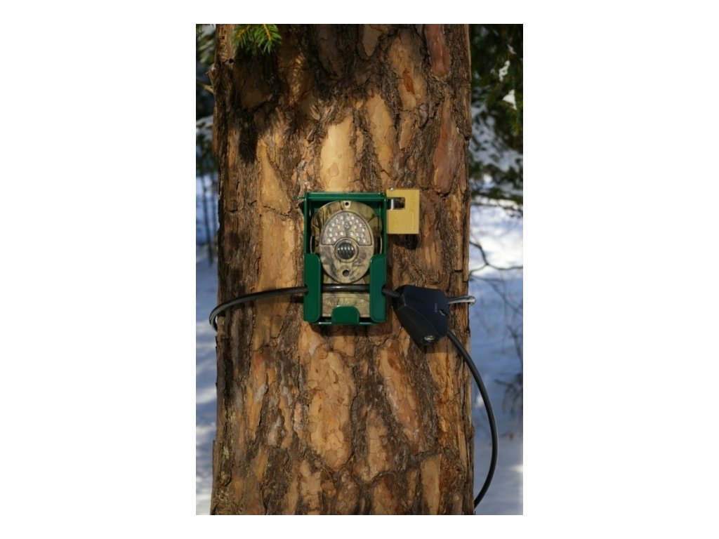 The lock has a 180 cm long steel rope that can hug any tree with a margin. The rope is threaded through a grommet on the photo trap (can also be combined with a locker), tightened and locked.