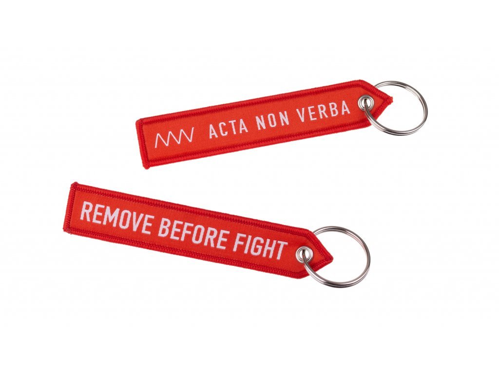 Klíčenka v čevené barvě s výšivkou "ANV Acta Non Verba" a "REMOVE BEFORE FLIGHT"