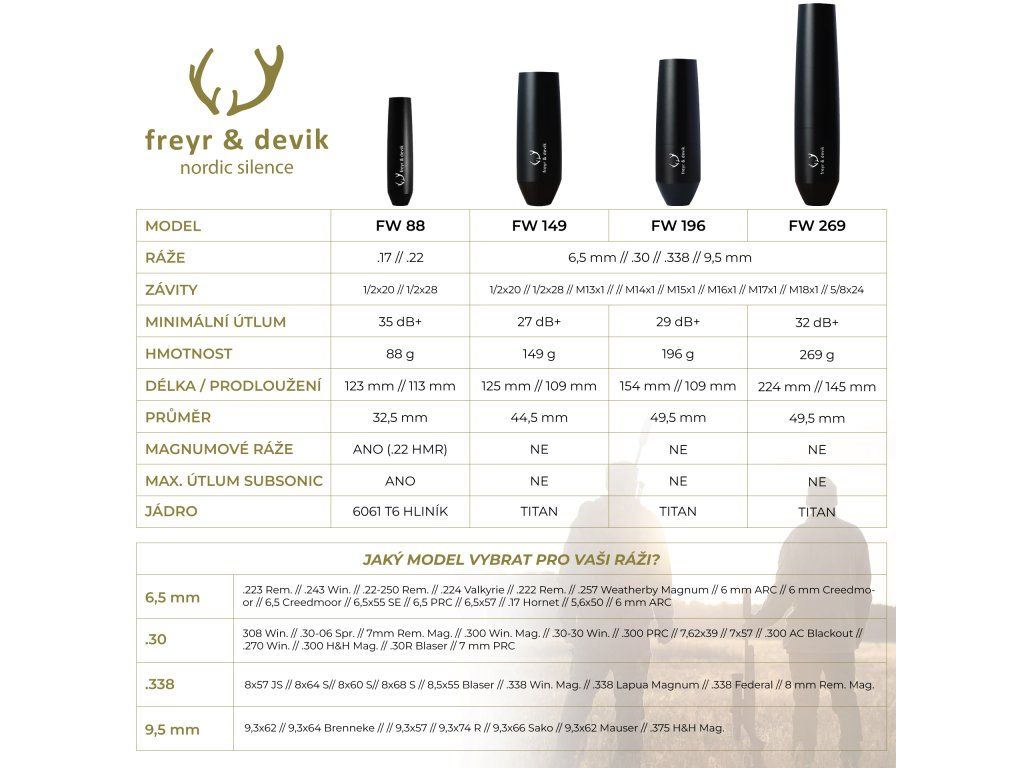 Tlumiče hluku norského výrobce Freyr a Devik jsou konstruovány s důrazem na precizní zpracování a použití nejmodernějších dostupných materiálů jako je titan a letecký hliník. Díky svému netypickému vzhledu jsou zaměřeny především pro použití na dlouhých loveckých zbraních, ale své využití naleznou určitě i na zbraních pro sportovní dálkovou střelbu. Z důvodu materiálů použitých k výrobě se jejich majitelé mohou spolehnout na nízkou váhu, útlum až 32 dB a uživatelskou přívětivost - to především proto, že k jejich rozebrání a čištění nepotřebujete žádné nástroje.