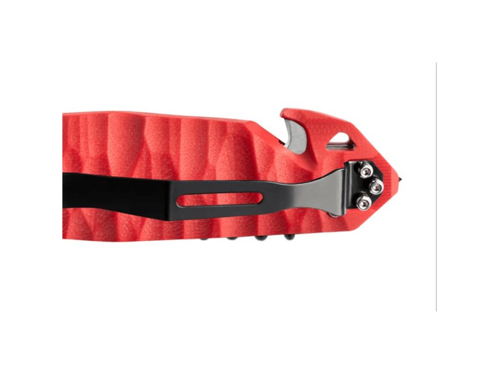 Rukojeť je tvořena dvěma šroubovanými střenkami, mezi nimiž je integrován řezák popruhů s vyměnitelnou zakřivenou čepelí pro rychlé přeříznutí pásů, lan nebo bezpečnostních pásů. Nůž je nabízen ve dvou variantách střenky: