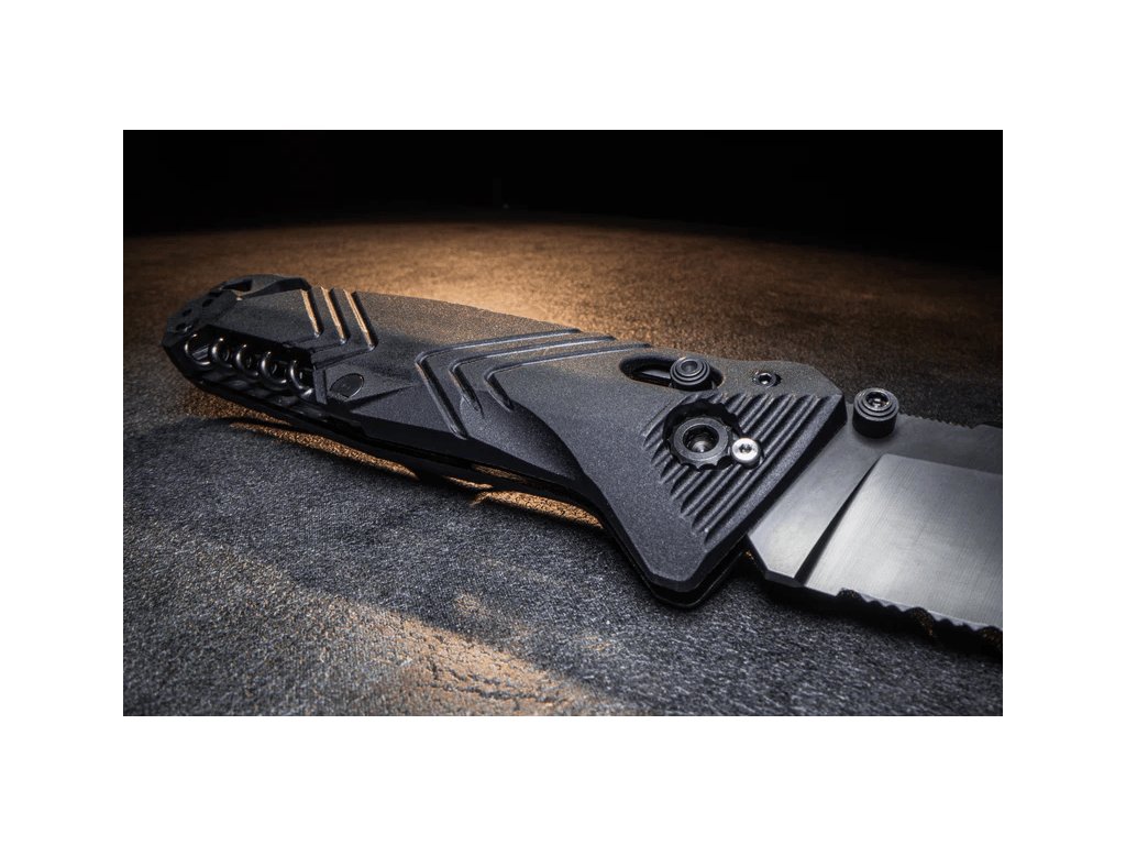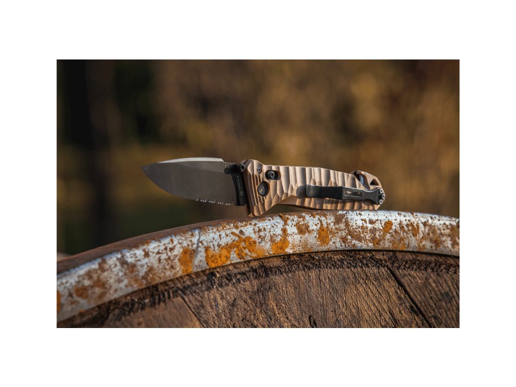 Nůž splňuje specifický armádní požadavek: jedná se o obouruční polní nůž, který lze bezpečně otevřít i zavřít jednou rukou. O to se stará spolehlivý zámek AXIS®, umožňující plně oboustranné ovládání. Ergonomická rukojeť z odolného materiálu PA6 s chevronovým vzorem zajišťuje jistý úchop i v rukavicích nebo za mokra.