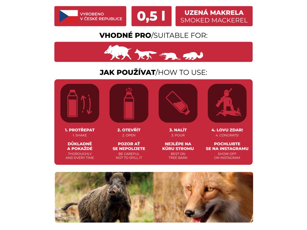 Liquid bait based on a mix of liquid extracts.Suitable for: Wild boar, foxes, badgers, martens and other predators.