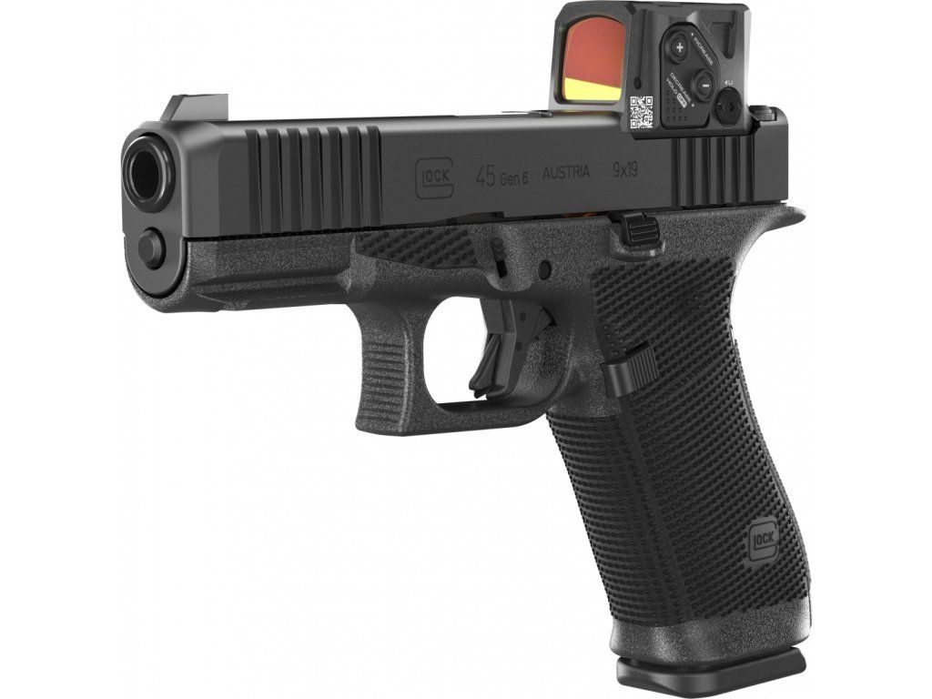 Glock 45 Gen6 A-CUT je pistole velikosti CROSSOVER v ráži 9 mm Luger v konfiguraci s kolimátorem Aimpoint COA, se závěrem s modulárním optickým systémem konstruovaným pro kolimátor Aimpoint COA.