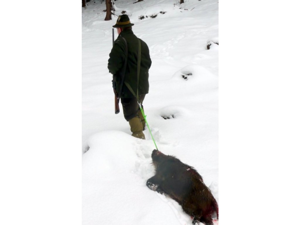 The strap is made of a wide shoulder strap, which is also equipped with a soft felt cover. A green rope is attached to this strap to tie the game by the snout, neck or runs.