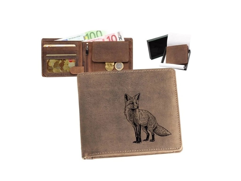 Peněženka je vyrobena z kvalitní broušené kůže s mysliveckým motivem. Peněženka má rozměry 10 x 13 cm a součástí balení je i krabička na tuto peněženku.