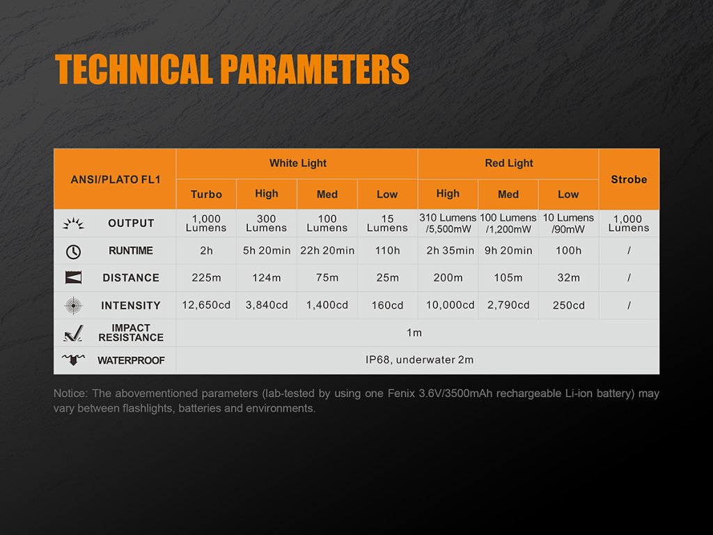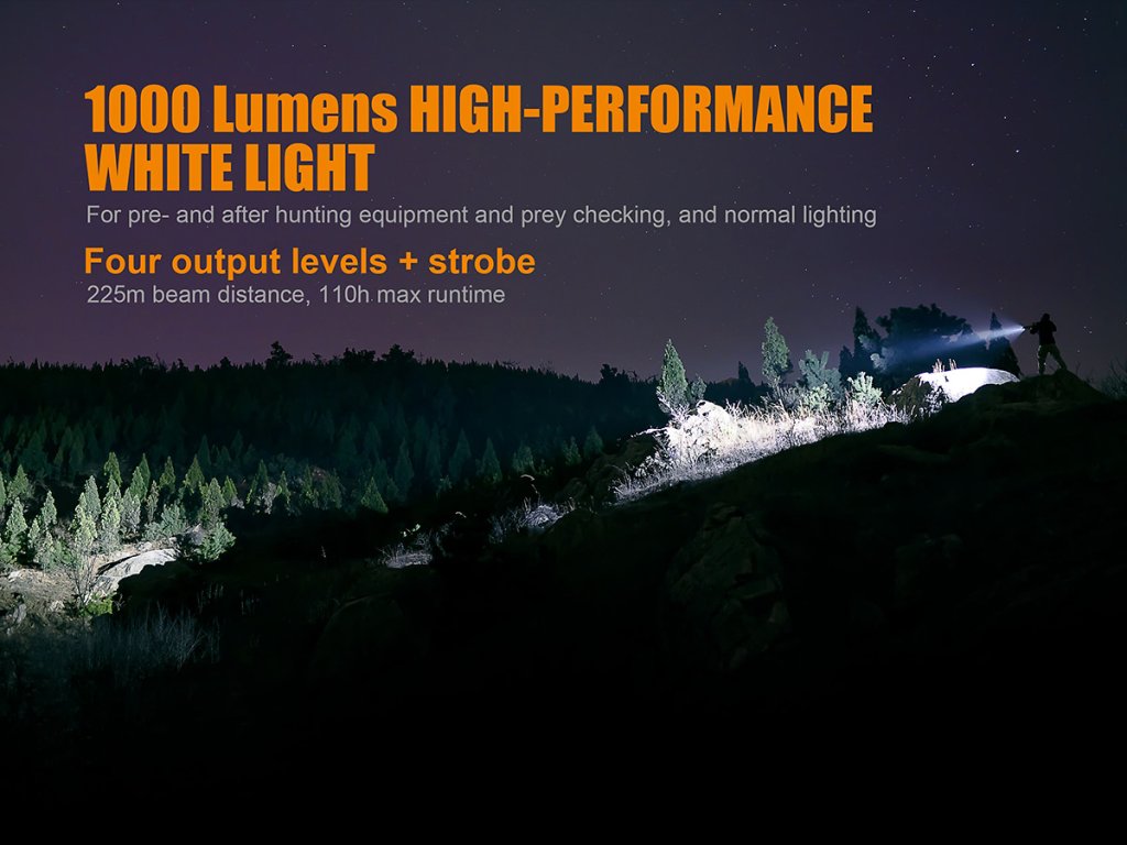 Pět režimů výkonu bílého světla: 1000 lumenů (2 hodiny) -> 300 lumenů (5,3 hodin) -> 100 lumenů (22,3 hodin) -> 15 lumenů (110 hodin) -> strobe (stroboskopické blikání).