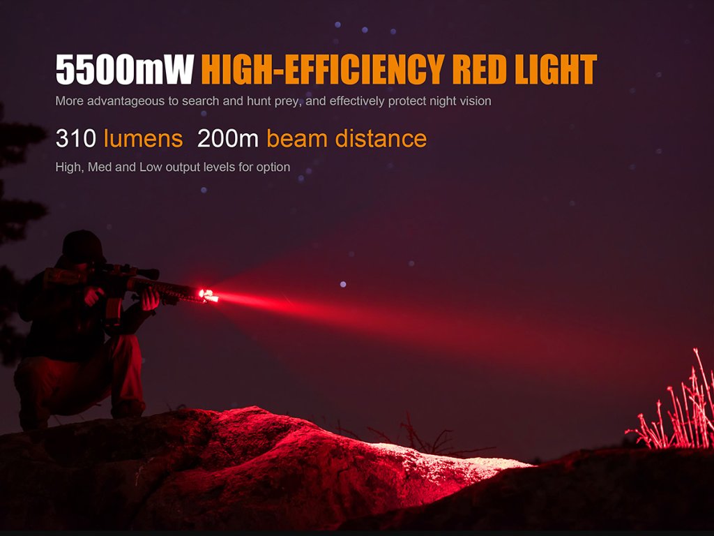 Tři režimy červeného světla: 310 lumenů/5500mW (2,5 hodiny) -> 100 lumenů (9,3 hodiny) -> 10 lumenů (100 hodin)