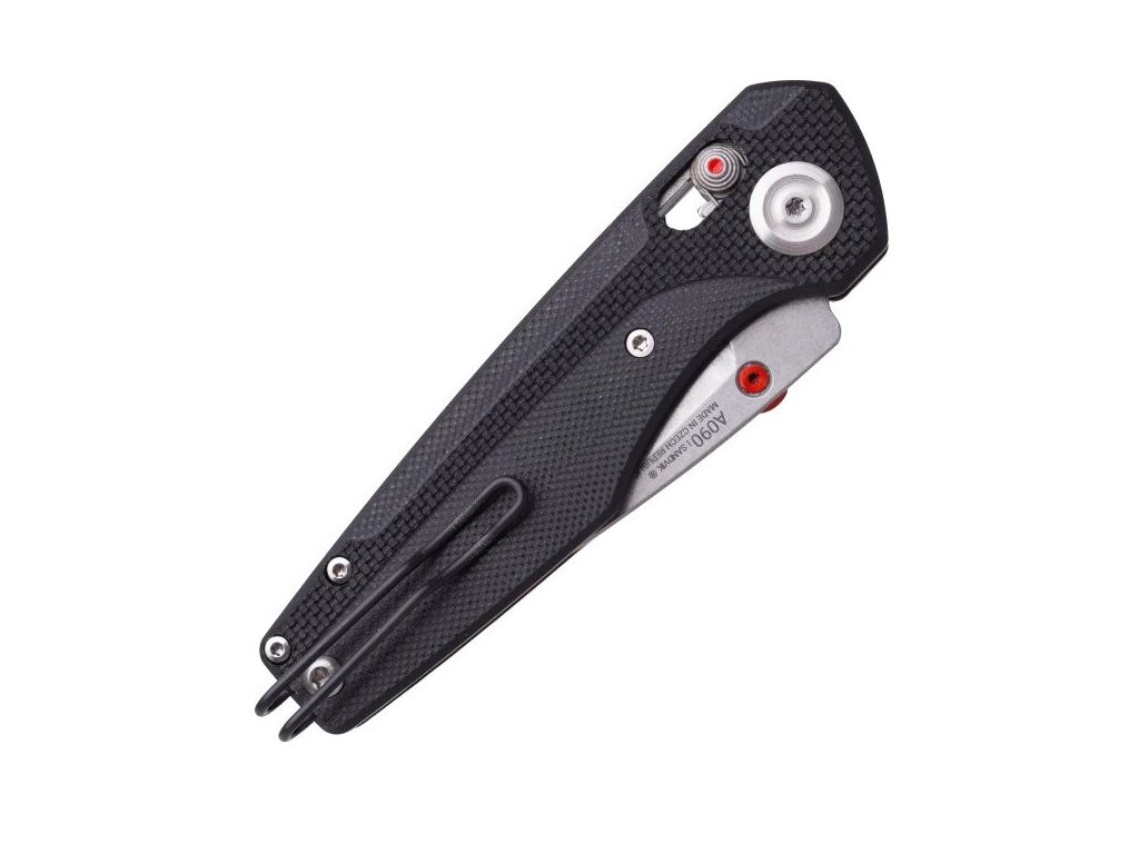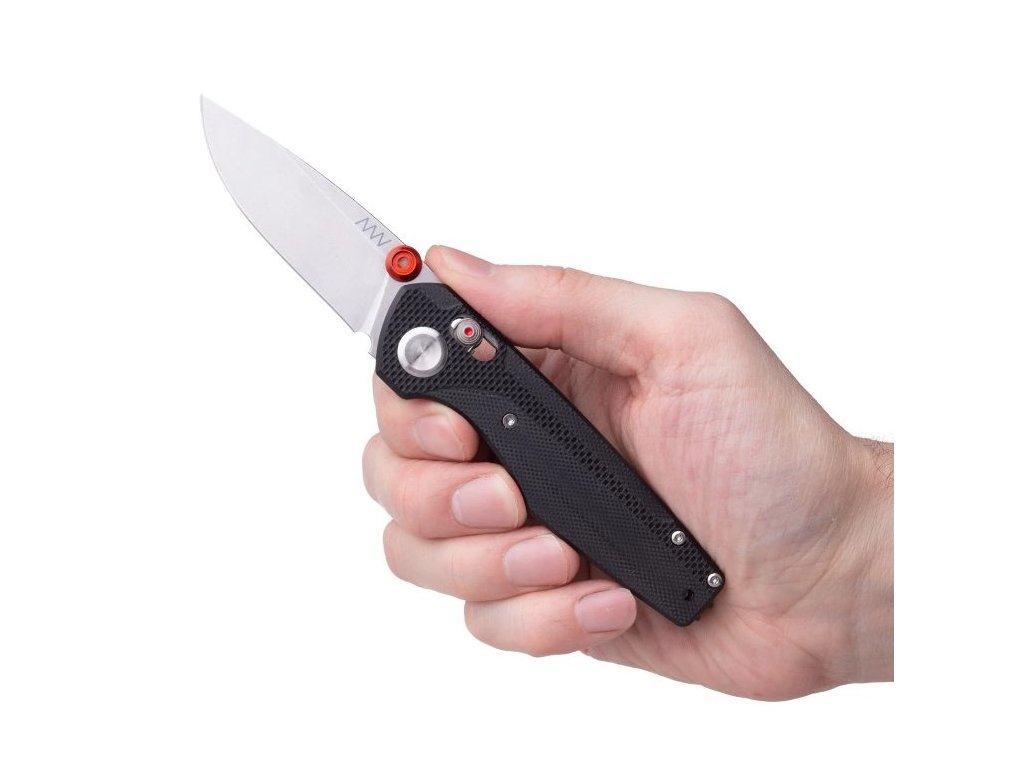 Konstrukčně vychází z modelu A200 a zachovává všechny jeho zásadní technické prvky. Otevírání jednou rukou zajišťuje červený oboustranný kolík s ANV lumidotem a čepel běží hladce díky uloženým ložiskům a pojistku obstarává spolehlivý A-lock mechanismus. Tvarované střenky z černého materiálu G10 s frézovanou strukturou nabízejí jistý úchop bez nadměrné agresivity, což se ocení i při delším používání.