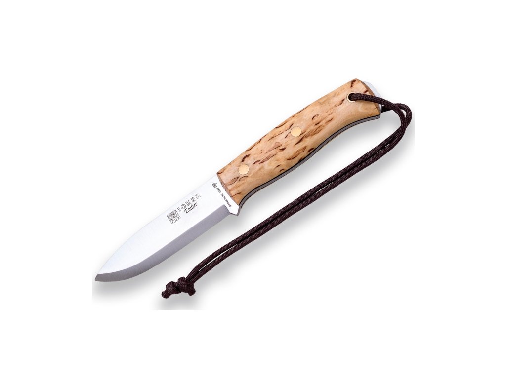 Joker Ember CL122-P je elegantní bushcraft nůž s plnou konstrukcí full-tang z nerezové oceli Sandvik 14C28N (57–59HRC). Čepel je dlouhá přibližně 105 mm a dokonale vybroušená na Scandi (drop-point profil), což z něj dělá univerzální nástroj vhodný pro štípání dřeva, přípravu ohně i řezání. Rukojeť z kvalitní různě strukturované břízy (curly birch) nejen krásně vypadá, ale díky kvalitnímu olejovému nátěru dobře padne do dłaně a zajišťuje spolehlný úchop i za mokra. Součástí balení je kožená pásová pochva s fire-steel křesadlem, které umožňuje rychlé zapálení ohně bez další výbavy.Doplňkové parametry