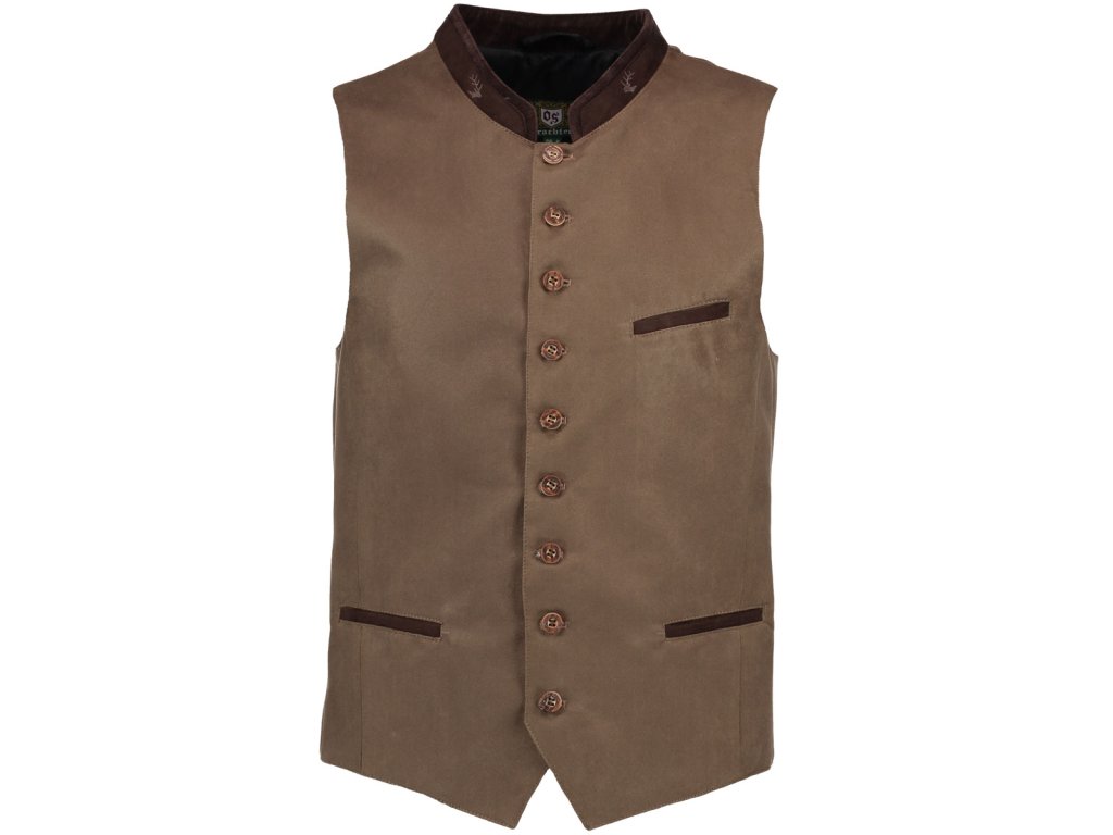 Vesta moderního vzhledu ve světle hnědé barvě s kontrastními doplňky ve tmavě hnědé. Knoflíčky jsou v napodobenině parohu.