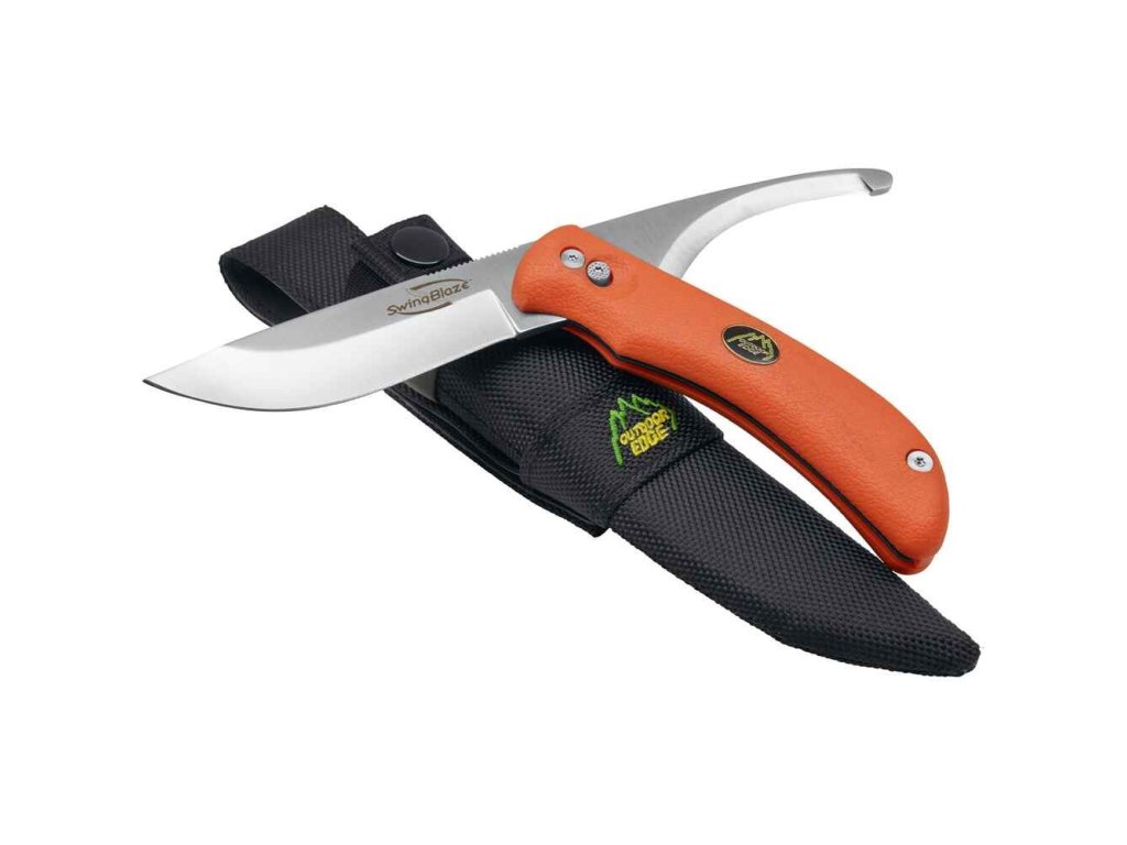 Lovecký nůž SwingBlade – od značky Outdoor Edge – nabízí dvě čepele v jednom těle: 3,6” (?9?cm) klasický drop-point pro stáhnutí zvěře a 3,2” (?8,1?cm) hákovou čepel pro přesné vyjmutí vnitřností bez poškození masa. Čepele jsou z japonské oceli AUS-8, subzero ochlazené, ručně dokončené pro výborné držení ostří. Rukojeť je z neklouzavého TPR-gumového materiálu, vhodná i při mokrých podmínkách. Součástí je odolné nylonové pouzdro na opasek.