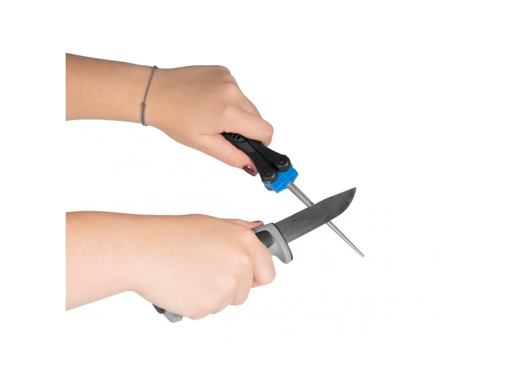 Skládací brousek s diamantovou tyčkou určený k ostření hladkých i zubatých čepelí, stahovacích háčků (gut hook) a rybářských háčků. Ideální pro rychlé doostření lehce otupených nožů i pro plnohodnotné ostření v terénu.