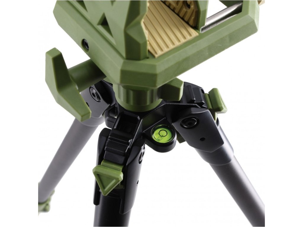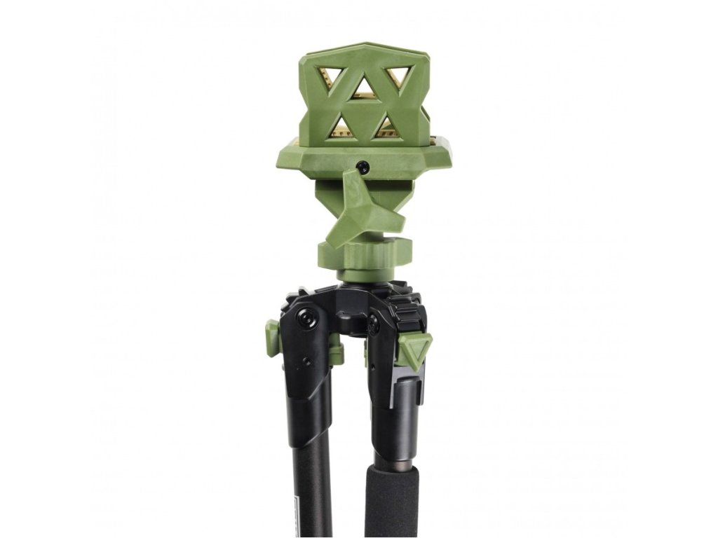 Hlava trojnožky je široký, nastavitelný držák Magna Switch, jehož vnitřek je opatřen měkkými gumovými lamelami. Takové řešení poskytuje pevnou oporu bez ohledu na šířku a tvar pažby. Důležité také je, že nezpůsobuje žádné otlaky ani škrábance ani u dřevěných pažeb. Trojnožky značky Primos si již léta mezi myslivci drží zaslouženou pověst díky praktickým řešením a vysoké spolehlivosti v terénu.