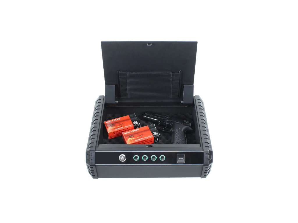 Kompaktní kazeta na uschování krátkých zbraní nebo menších cenností, šperků či menšího obnosu hotovosti. Jedinečností kazety je možnost zvolit si, jak uschované věci ochráníte. Můžete kazetu zamknout díky otisku prstů, číselné kombinace nebo pomocí nouzového klíče. V paměti kazety je možné uložit až 20 různých otisků prstů. Kvalitní ocelová konstrukce zvyšuje odolnost a zároveň bezpečnost kazety. Potěší vnější potažení gumou a vnitřek potaženy měkkým postrování. V případě potřeby je možné kazetu upevnit pomocí přiloženého kotvícího materiálu.