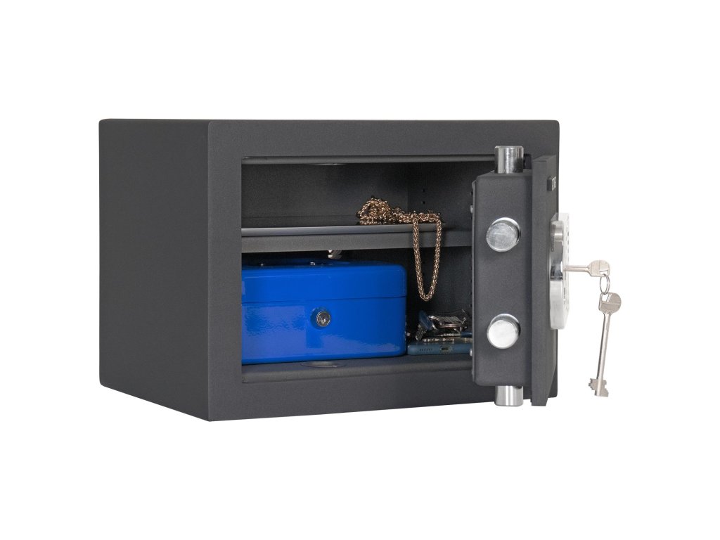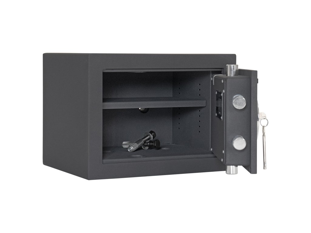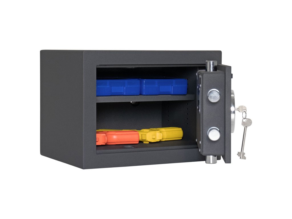 Hlavní výhody: Certifikovaný trezorový zámek s 2 klíči Bezpečnostní třída I (ČSN EN 1143-1) Trezor má dvouplášťové dveře s tloušťkou 12 mm Dveře trezoru lze otevřít v úhlu 90 ° Rozvorový uzamykací mechanizmus zajistí uzamčení na 3 stranách. Dodávané s 1 vyjímatelnou poličkou Otvory na ukotvení na spodní a zadní straně trezoru Nejmenší trezor z modelové rodiny Toscana má bezpečný klíčový zámek se 2 klíči a disponuje bezpečnostní třídou I (ČSN EN 1143-1). Dvouplášťové provedení s tloušťkou korpusu 12 mm. Vnitřek trezoru je předělené vyjímatelnou poličkou, která se hodí v případě uskladnění menších cenností, které je lepší mít pěkně v trezoru roztříděny. Připraveny jsou otvory na spodní a zadní straně, abyste si mohli trezor okamžitě připevnit. Kotvící materiál je součástí dodávky. Kování zvyšuje celkovou vnější hloubku trezoru o 15 mm.Doplňkové parametry