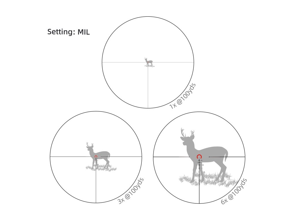 První obrazová rovina (FFP) – zaměřovací mířítko se zvětšuje spolu se zvětšením, takže odhad vzdáleností a výpočty držení platí ve všech stupních zvětšení