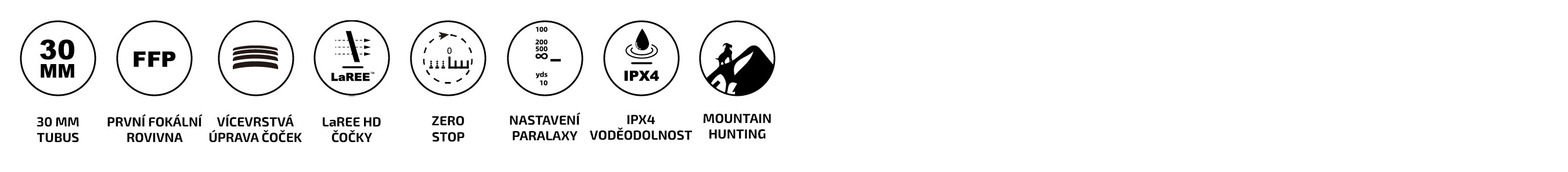 | Umístění záměrného kříže | První fokální rovina (FFP) |