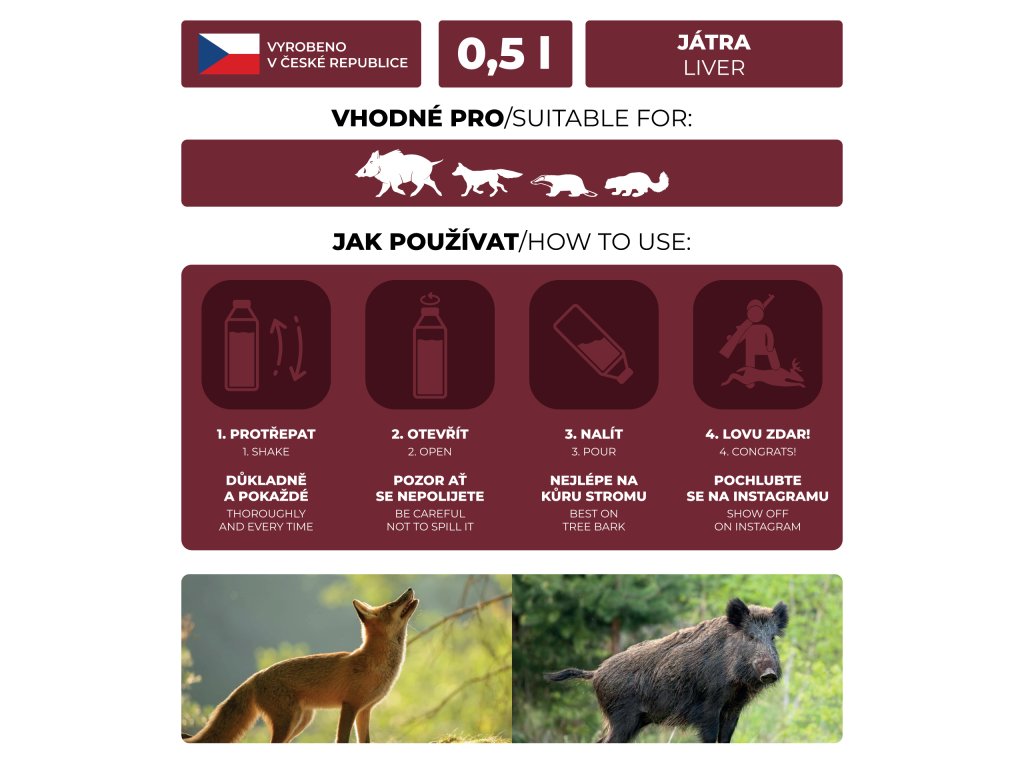 Tekuté vnadidlo vyrobeno z celých jater pro maximální účinek. Vhodné pro: Divoká prasata, lišky, jezevce, kuny a jiné predátory.
