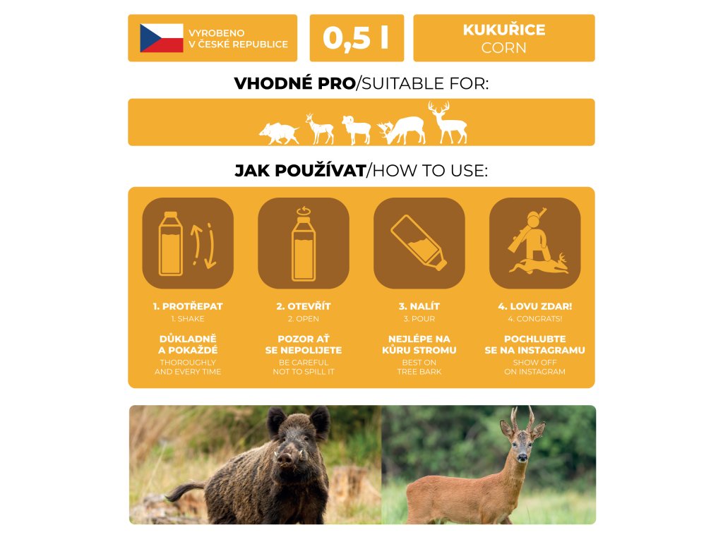 Tekuté vnadidlo na základu mixu z tekutých extraktů. Vhodné pro: zvěř srnčí, mufloní, dančí, jelení a losí a divoká prasata.