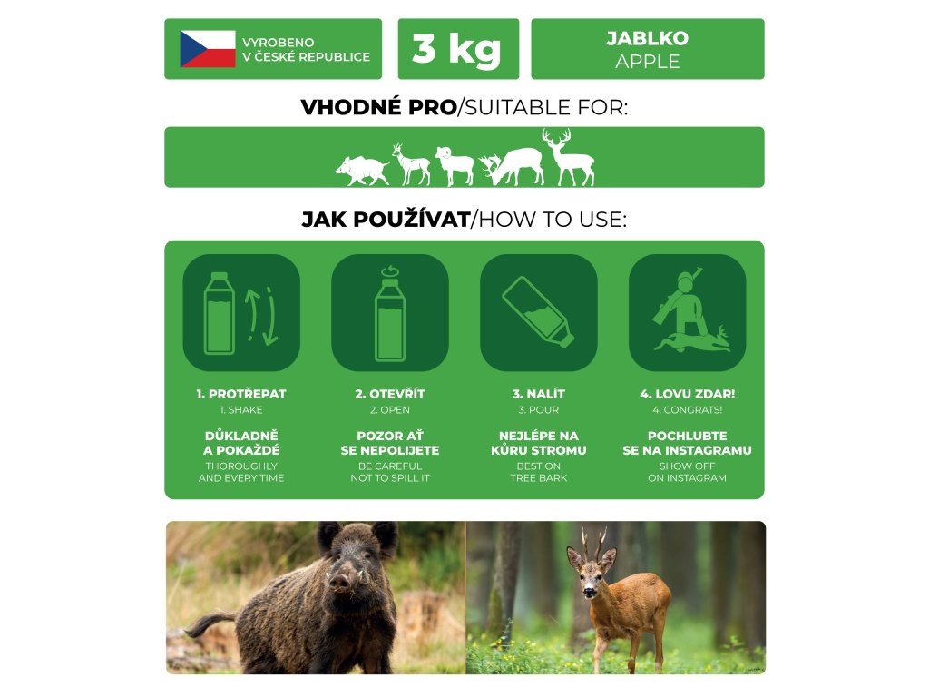 Pastu naneste v blízkosti krmeliště, nebo na místo kam chcete zvěř vnadit a to na dřevěné kůly nebo ji jednoduše rozetřete na pařez, kmen či kámen