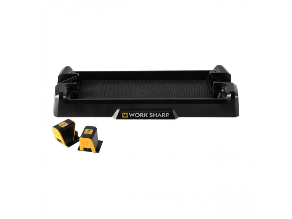 Work Sharp Whetstone je oboustranný keramický brousek vybavený stabilní základnou s vodní nádržkou a dvoustupňovými vodítky úhlu.