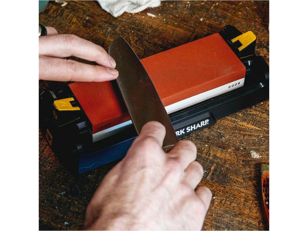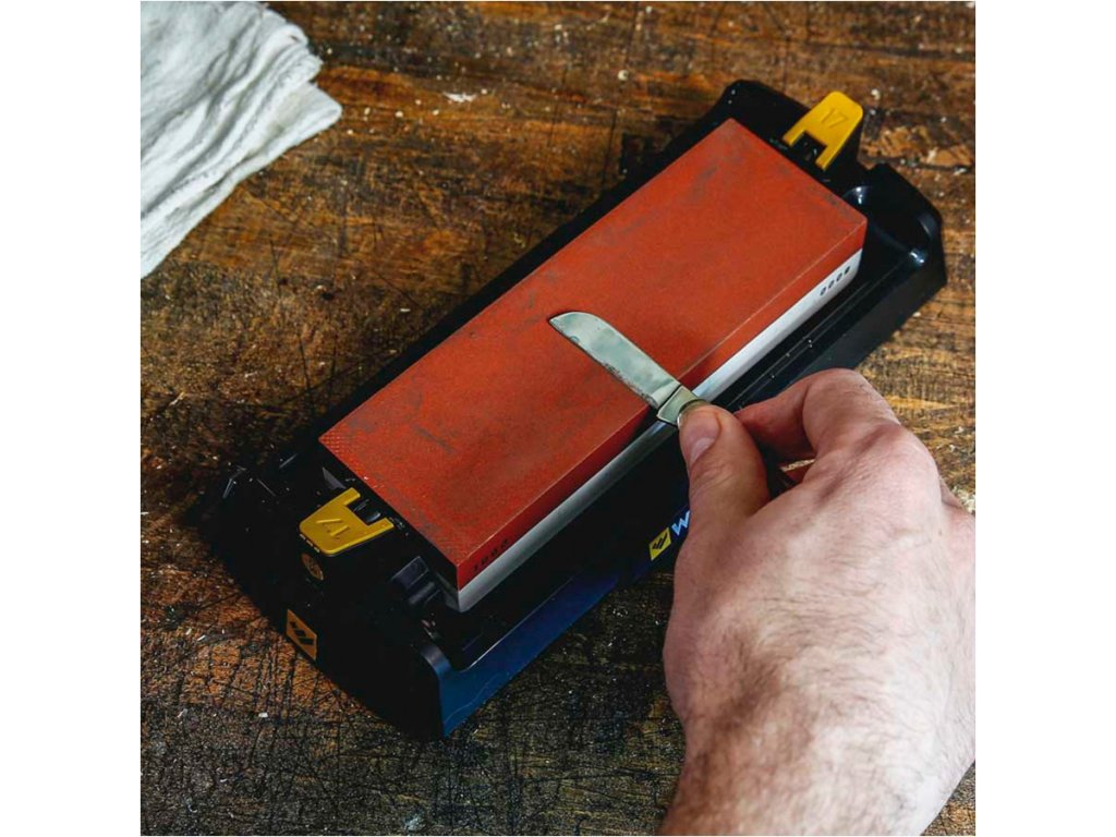 Work Sharp Whetstone používá velký oboustranný vodní kámen, který umožňuje ostření malých i velkých nožů.
